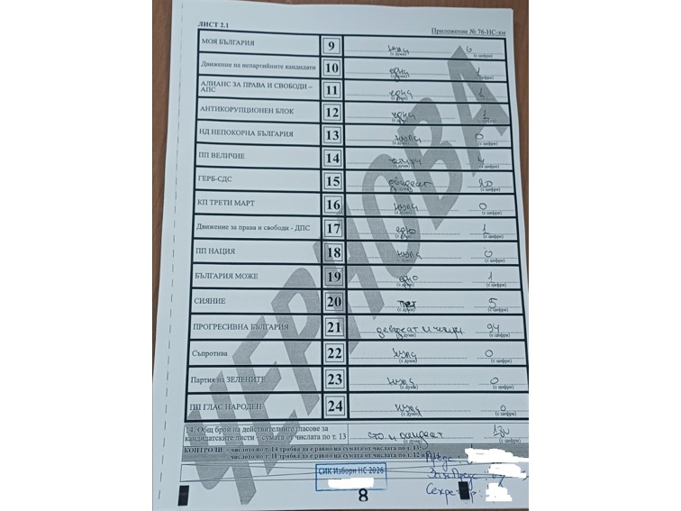 По установената процедура окончателният протокол следва да бъде ясен, еднозначен и без поправки. Наличието на зачерквания и пренаписвания в такъв документ не е просто технически детайл - то е индикатор за затруднения в процеса на първоначалното му съставяне. В практиката подобни ситуации често възникват при проверка от страна на Районна избирателна комисия, когато се установят несъответствия и се налагат корекции на място, вместо изготвяне на изцяло нов протокол.